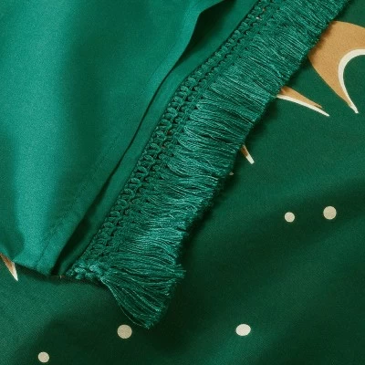Give a fresh, serene makeover to your bedroom with the Printed Comforter & Sham Set from Opalhouse™ designed with Jungalow™. The comforter features a stylized scale-like print and dots in yellow and white on a rich teal background along with fringed trim for a stunning look. The matching pillow sham completes the coordinated set, and it has a six-inch envelope closure that neatly secures the insert while still allowing for easy removal. This bedding set is made from 100% cotton for convenient year-round comfort, and both comforter and sham are machine-washable for easy cleaning. Pair this bedding set with cream bedsheets to enhance the clean, sophisticated look, then top with throw pillows in coordinating colors to finish a lovely setting.